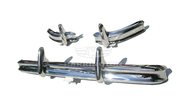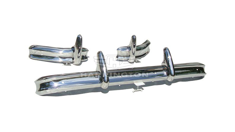 Brand new stainless steel bumpers for Jaguar XK140 (1954–1957). Kit consists of 1 front bumper with 2 over riders, 2 rear corner bumpers with 2 over riders.